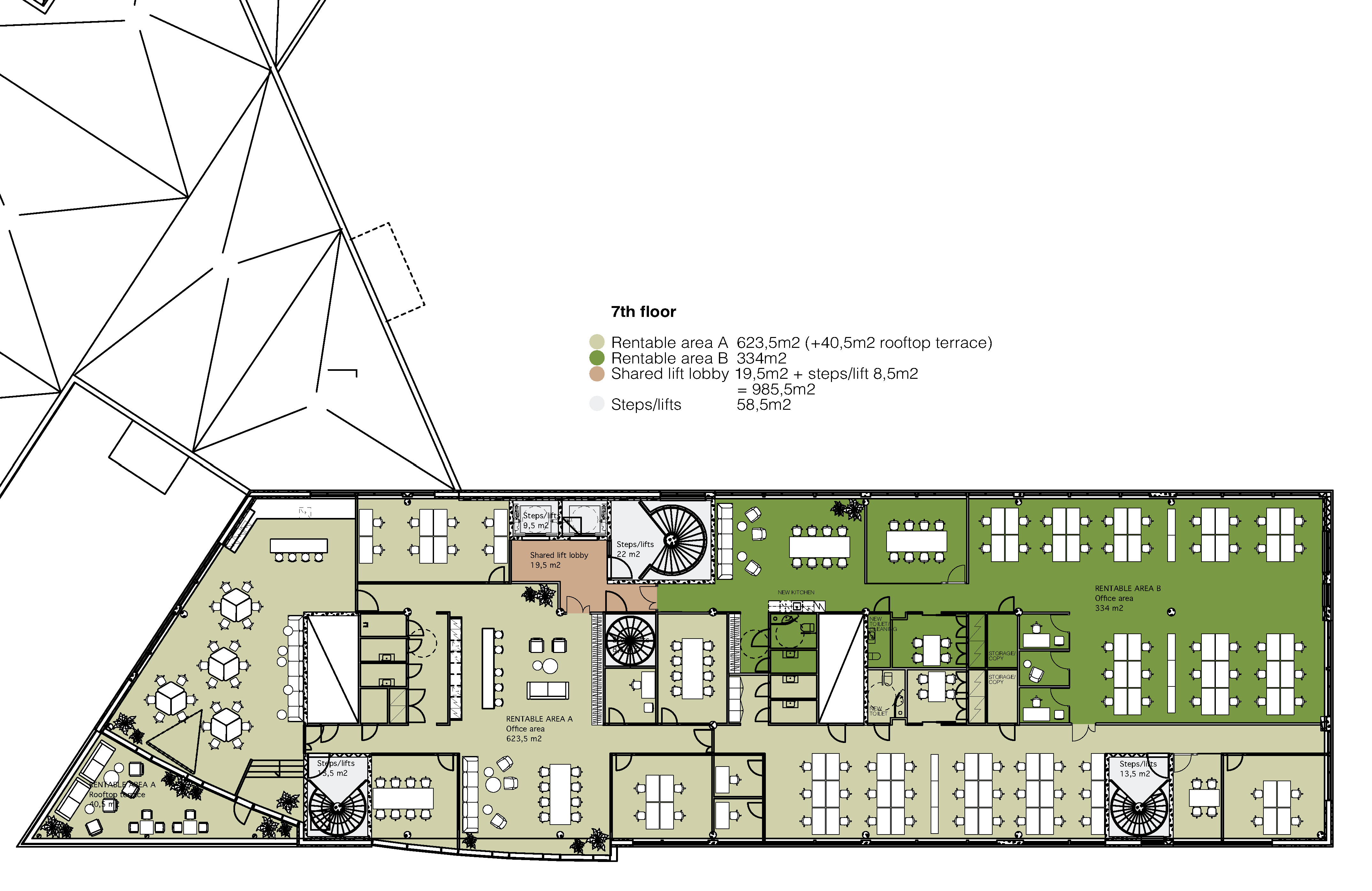 Tiloihin voidaan rakentaa joustavasti avoimia työtiloja, kokoushuoneita ja toimistohuoneita. Ylimmän kerroksen premium-tiloista avautuu hieno näköala ja oma terassi, joka yhdistyy työskentelykahvilaan.